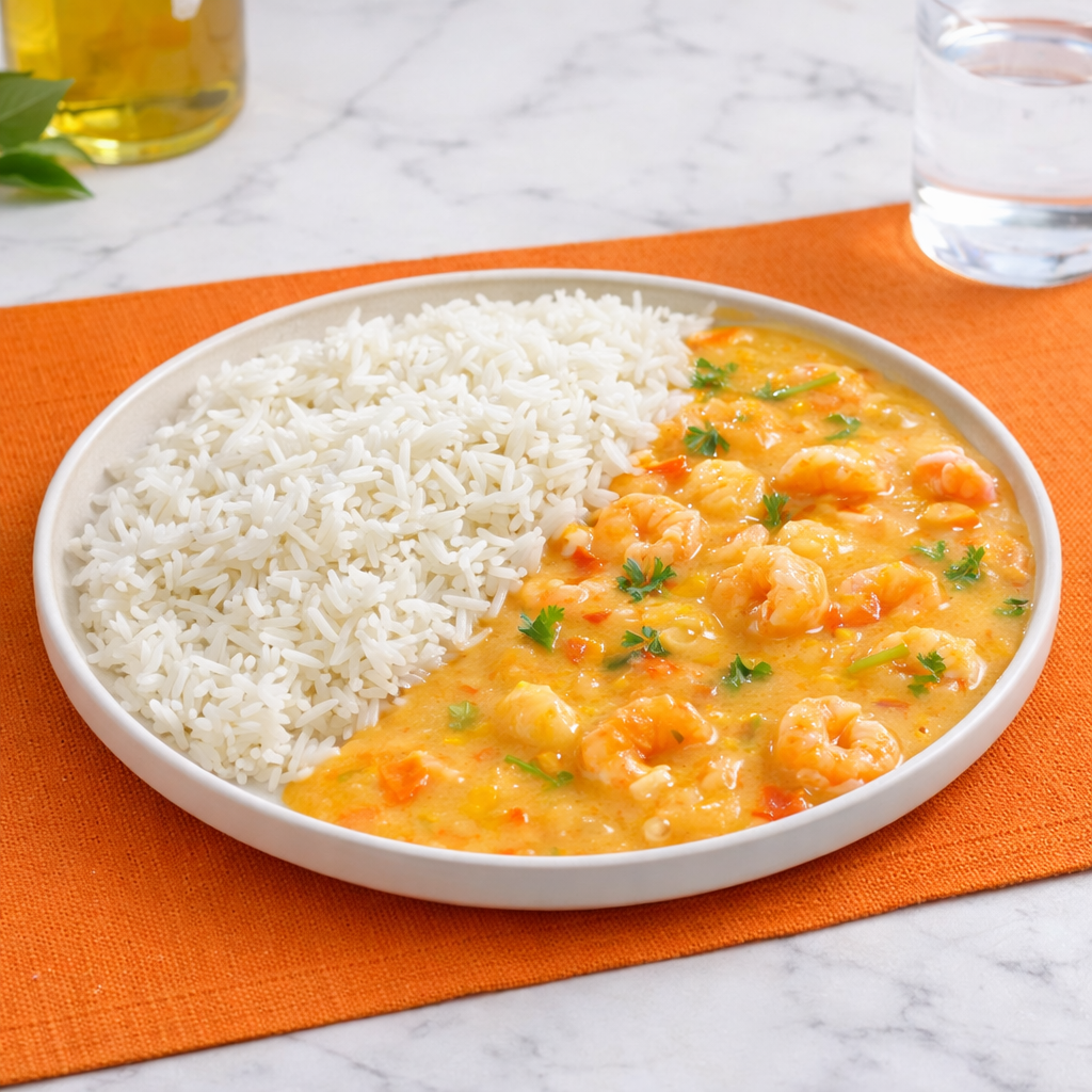 Bóbo de camarão, preparado com mandioca e mix de pimentões coloridos. Acompanha arroz branco, preparado com temperos naturais