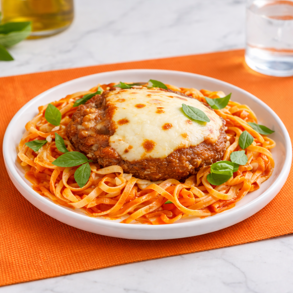 Polpetone na cama de fetuccine, feito com carne de patinho, temperado apenas com temperos naturais, alho cebola, cheiro verde. Coberto com molho de tomate artesanal. e finalizado com queijo muzzarela zero lactose