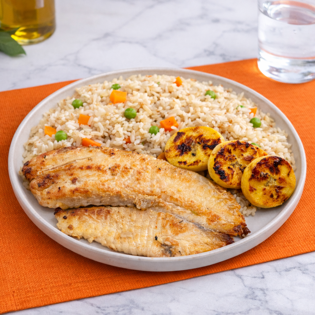 Tilápia marinada em especiarias naturais, acompanha arroz integral a grega e banana da terra grelhada.