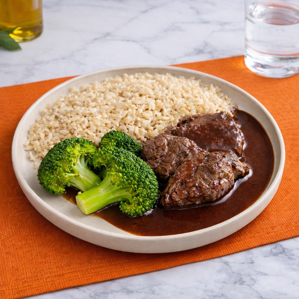 Filé mignon ao molho de vinho feito por nós. Acompanha arroz integral com brócolis
