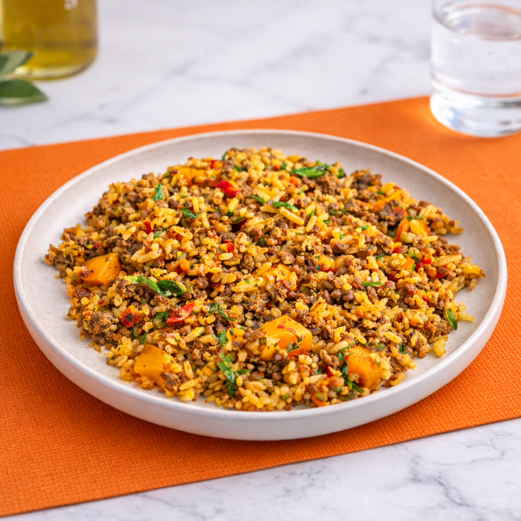 Patinho moído preparado com arroz branco, abobora cabotia, abobrinha, cenoura, mix de pimentões
